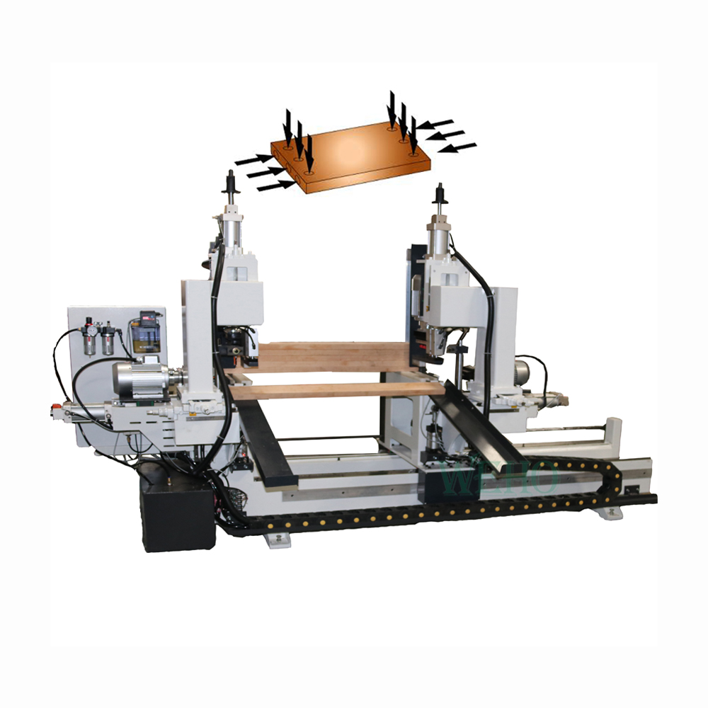 Станок имеет рабочий стол, прижимное устройство, вертикальную и горизонтальную сверлильную головку, на которую можно устанавливать несколько сверл, он может сверлить два конца древесины одновременно в вертикальном и горизонтальном направлениях.